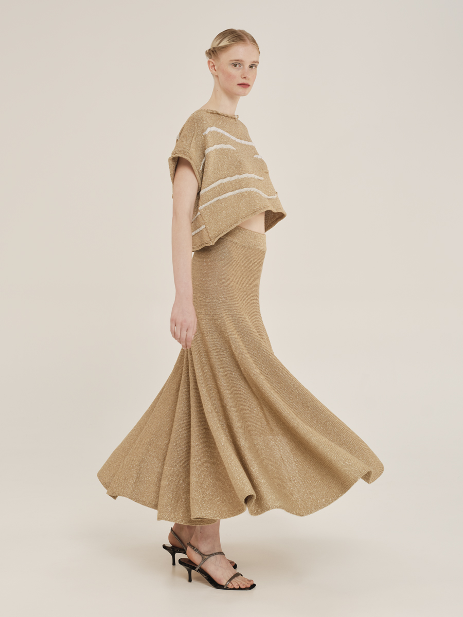 This shimmering midi knit skirt is crafted from lurex viscose yarn and features an elastic waistband for a comfortable fit