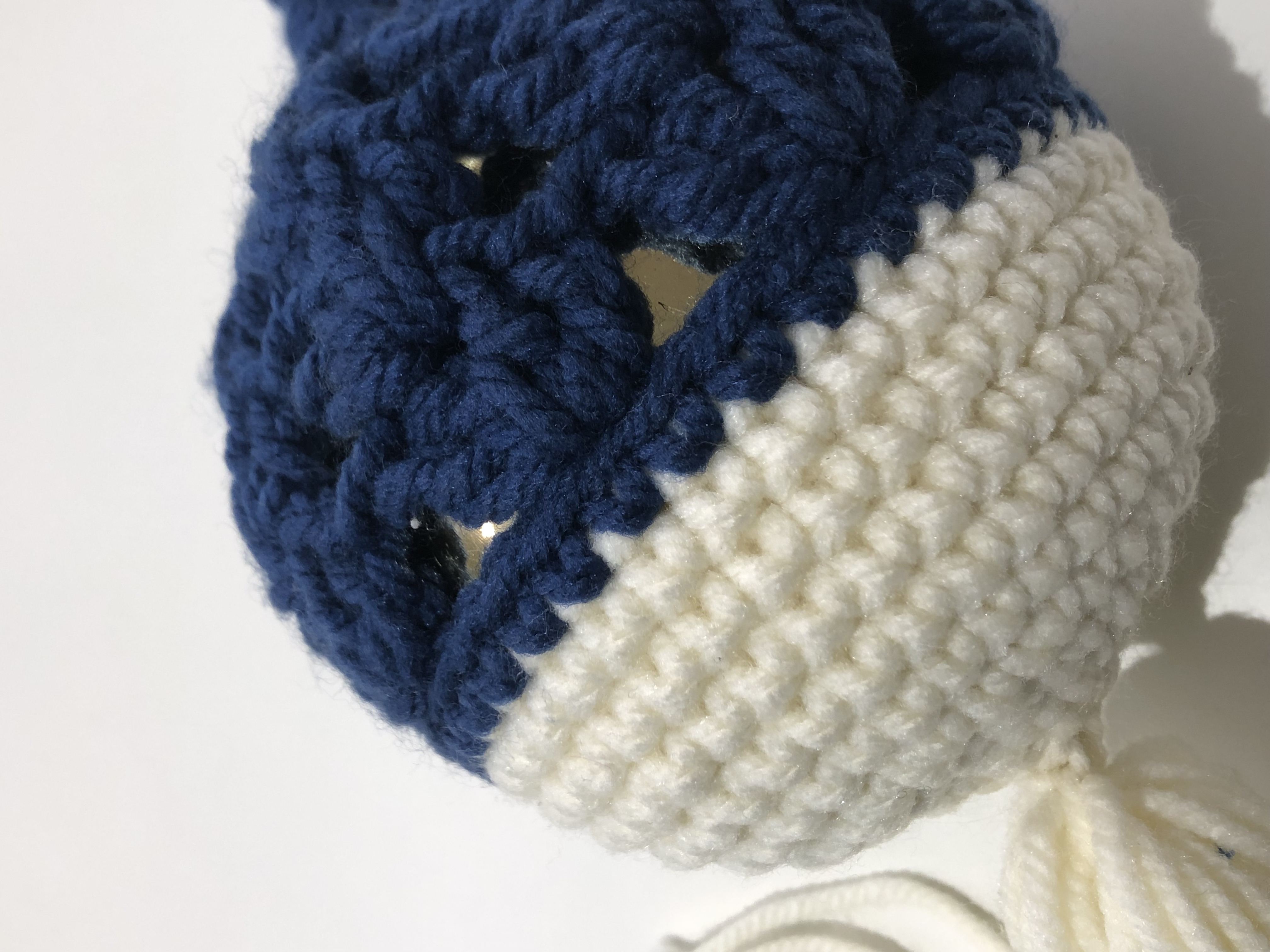 Σημείωση: Χειροποίητη πλεκτή μάλλινη Χριστουγεννιάτικη μπάλα σε λευκό/μπλέ συνδυασμό.