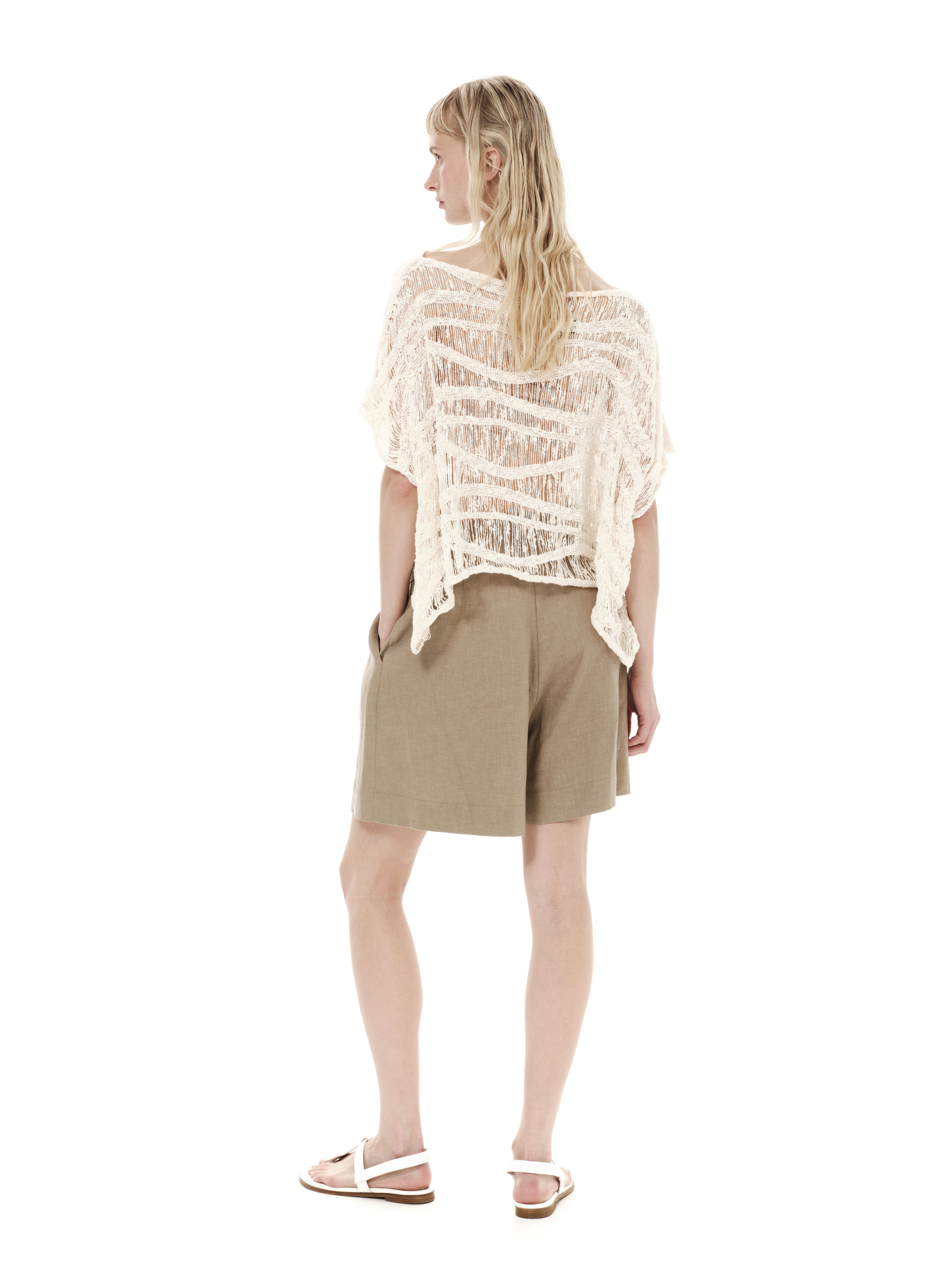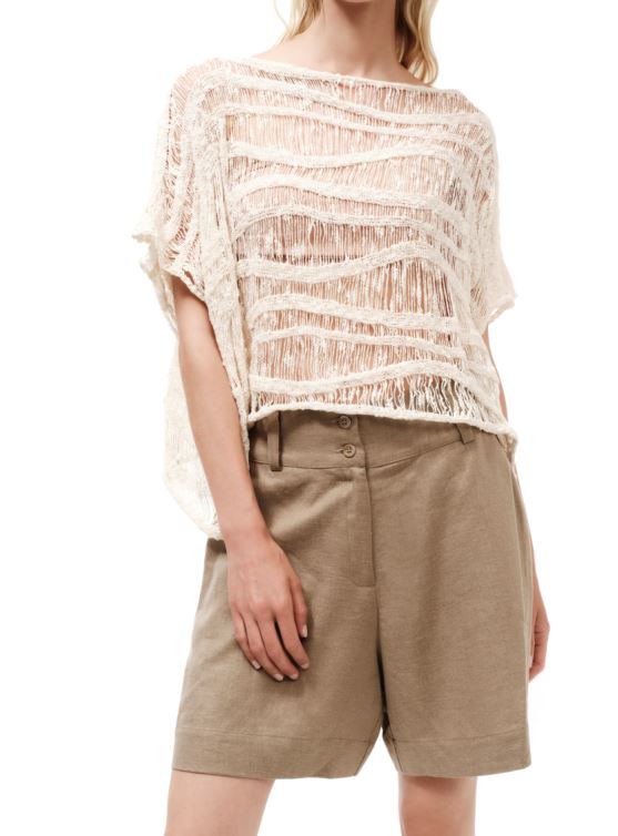 Κοντομάνικο πλεκτό τοπ με στρογγυλή λαιμόκοψη και διάτρητη πλέξη, σε άνετη γραμμή.